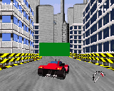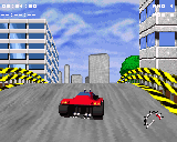 On my 68030/50Mhz playing the game in the full screen 1x1 was a little slow, it was still playable but the smaller screen mode or the 2x2 are much better. As well as just out-racing the opponants there are other ways to slow them down, yep thats right, you can blast them away too! This should add an extra element to the game. A few things that did worry me in the demo were firstly the control. This seemed somewhat sluggish and at times it was very hard to control the car also the car just spins out of control for no apparant reason. Another problem was that the scenary pop-up was a little close, this makes things a little difficult when your trying to see what is coming up next, sometimes you can just crash because you didn't see a corner coming until it was too late.
