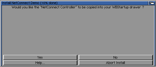 This option is asked to expert users and is recommended. The NetConnect main exceutable (which is quite small incidentally) will be copied to your WBStartup drawer which means that the NetConnect icon bar is started when you boot your machine.