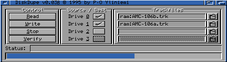 A yet to be released disk duplicater. This program program works with up to 4 floppy drives at the same time. The disk is written to a disk to, or read from, an disk image file of exactly 901120 bytes. The program uses one of my own extensions to the AppWindow - AppGadgets... drag and drop filenames into the string gadgets :).