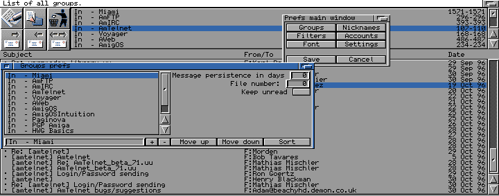 The preferences system consists of several child processes to the main prefs window of MagicMail. This allows you to edit the group list while having the filter window opened at the same time. MagicMail will have unlimited number of groups and filters. The "Account" preference window allows you to set up multiple e-mail (POP) accounts, and check all accounts at the same time when looking for new mail.