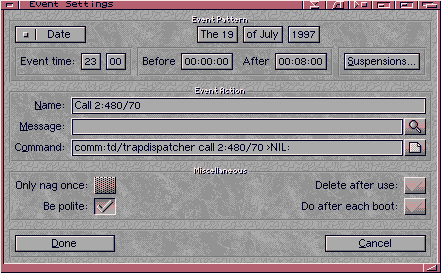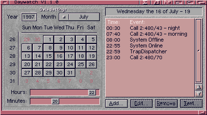 Daywatch is an advanced daemon - a program to run specified system events at specified times, on chosen days, etc., and also a reminder-program for important meetings, etc. Daywatch is very stable, has a good interface and is extremely easy to use.